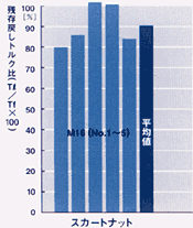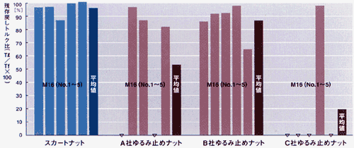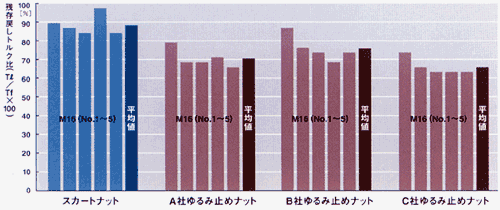 | この試験では、衝突回数:3万回(加振時間:15分)の振動に耐えて、供試ナット全てにおいてナットの脱落は生じなかった。そこで、各ケースにおいて、戻しトルク:Tlを測定し、耐ゆるみ性の評価として、残存戻しトルク比(Tl/Tf×100)を算出した。各供試ナットの平均値は、1.スカートナット88%、2.A社ゆるみ止めナット70%、3.B社ゆるみ止めナット76%、4.C社ゆるみ止めナット66%となる。この試験結果によって、スカートナットの耐ゆるみ性が、他の供試ナットに比べて非常に優れているということが、実際に認められた。 |